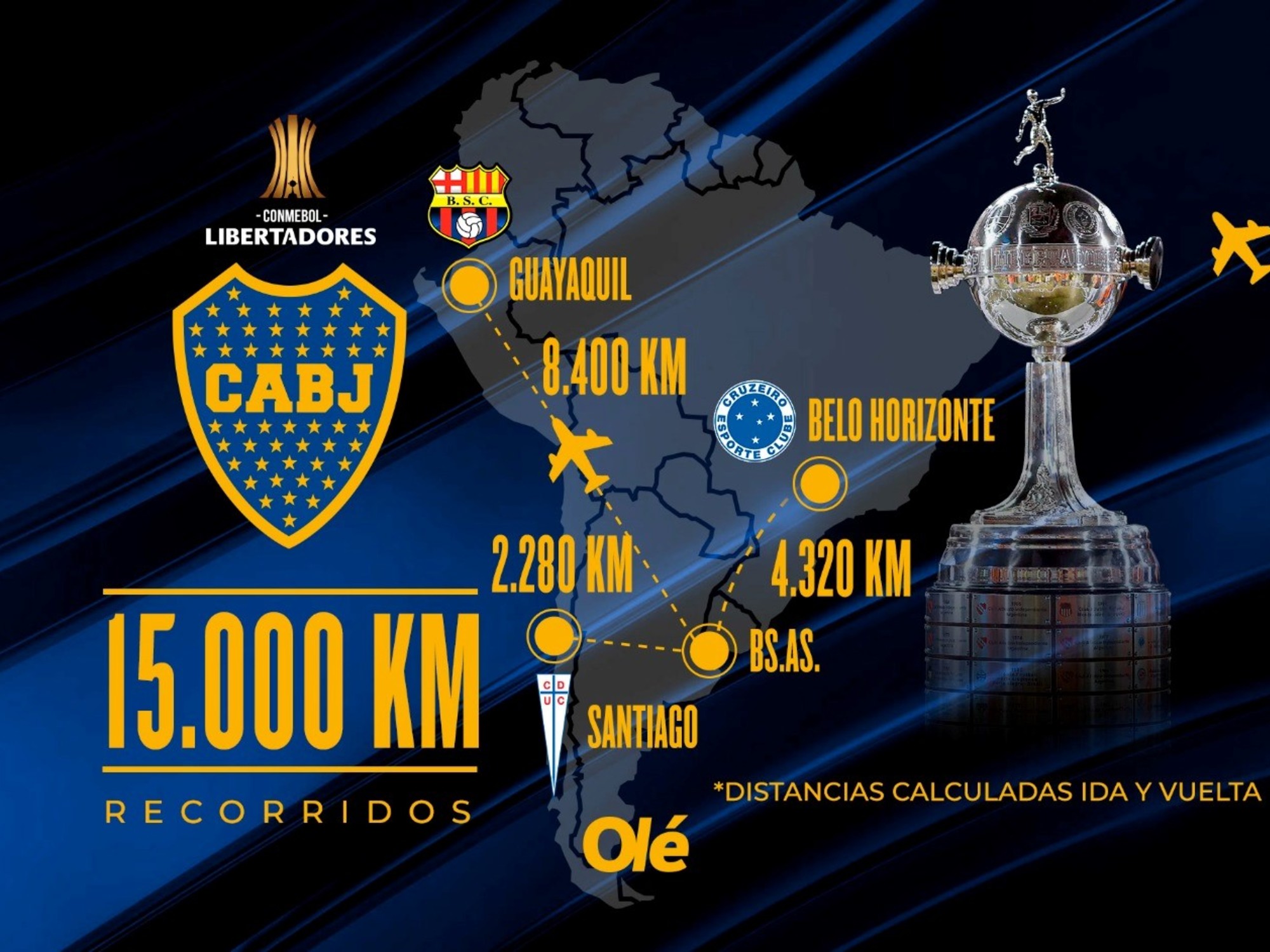 Dentro del grupo, Boca deberá viajar a Belo Horizonte, en el sudeste de Brasil, para enfrentar a Cruzeiro, a Santiago de Chile para enfrentar a Universidad Católica y a Guayaquil para jugar ante Barcelona, justamente el rival que más kilómetros le sumará en esta fase.