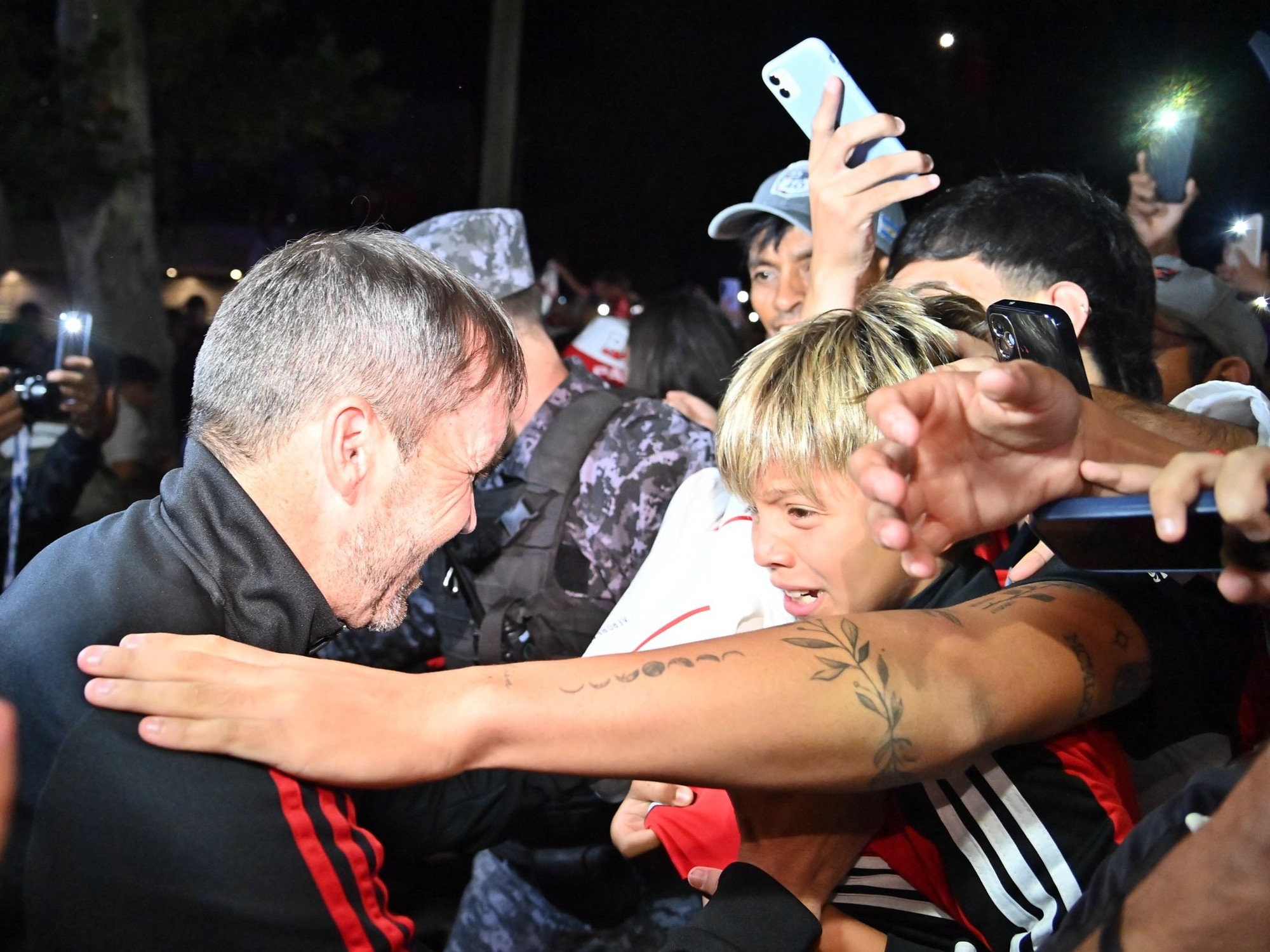 Mientras los hinchas hacen una fila prolija para tomarse fotos con la réplica de la Copa Libertadores 18, otros cientos hacen vigilia prolijamente en dos cuadras a la redonda del Urumpa Hotel & Spa de Río Cuarto. El cotillón está. Banderas, camisetas, fernet, pritiado. Una espera única para una visita ídem: la de River. Un cuadro que después de 42 años regresa a la ciudad.