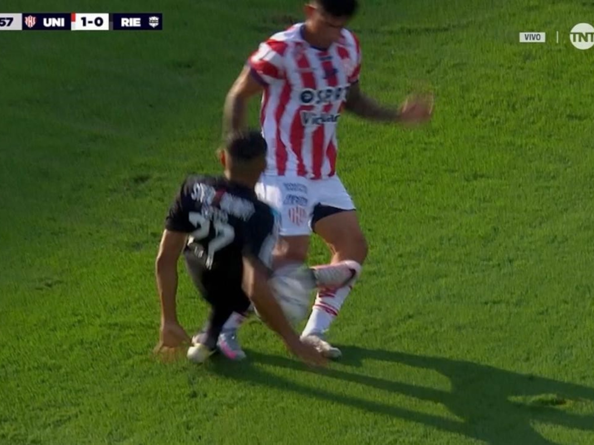 Por esa jugada Galló se terminó lesionando. Y el Tata Benítez mandó a la cancha a Yonathan Goitía. Sin embargo, el defensor ingresó pasado de revoluciones y en su primera intervención en el partido vio la roja. El marcador de 31 años entró a los 23:50 de juego, y a los 25:15 le metió un tremendo planchazo a Lautaro Vargas.